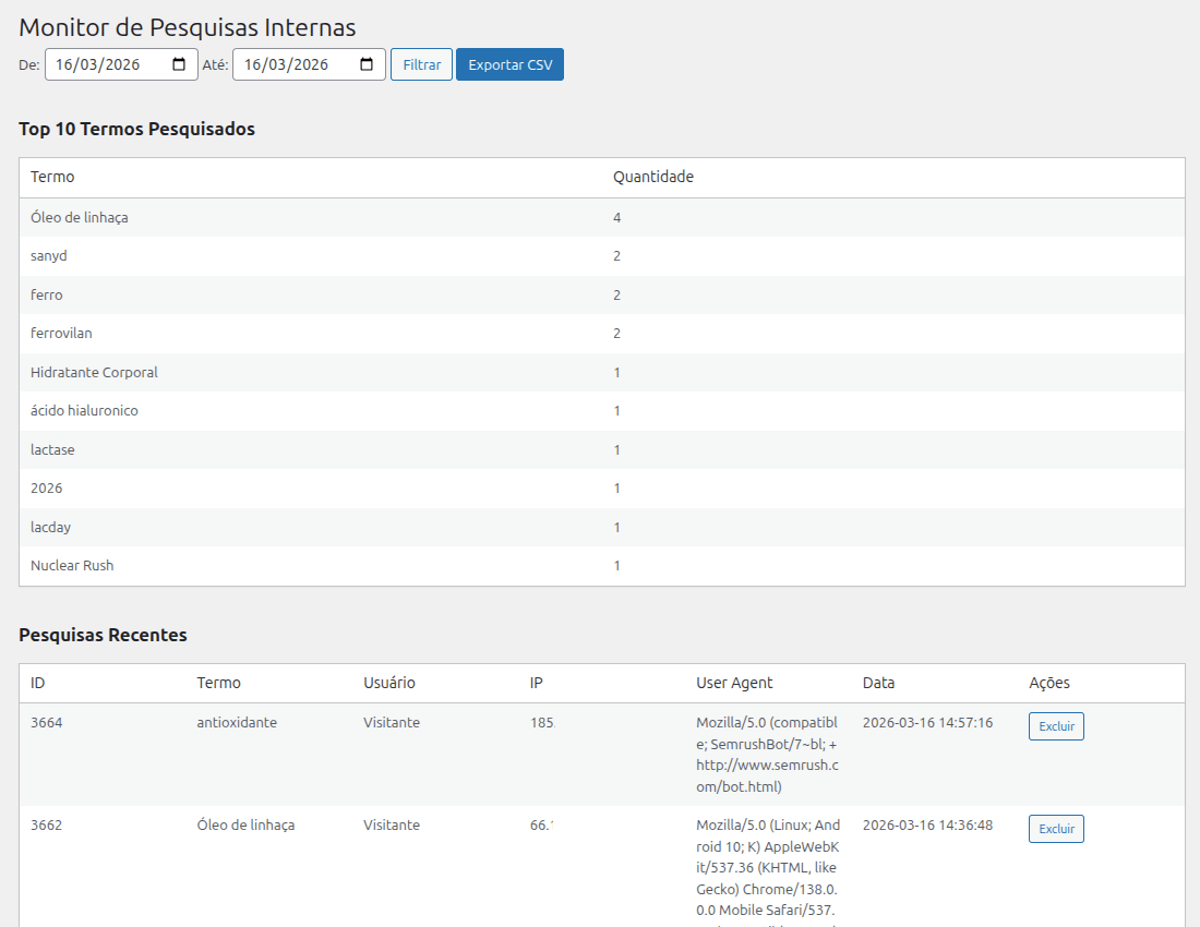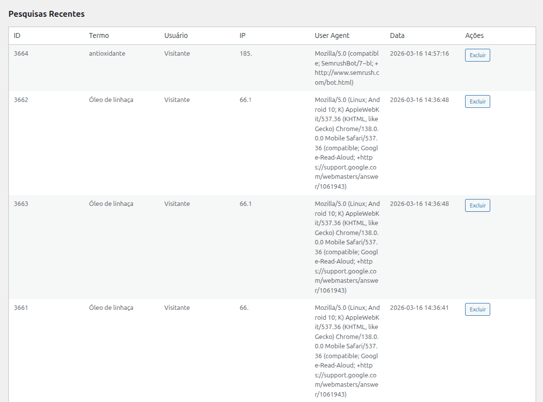 Esses dados podem ajudar administradores de sites a detectar scraping de conteúdo, monitorar bots e compreender melhor o perfil de tráfego que utiliza a busca interna do site.